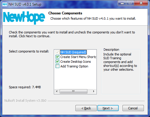 To add the Training system software and associated links (such as you have selected), select the Add Training Option box. If you have already installed or updated SUD and now subsequently want to add the Training system, simply re-install SUD.